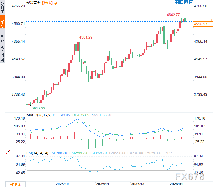 汇通财经APP讯——冰岛前总统格里姆松严正警告,美国若武力夺取格陵兰将导致西方联盟与国际秩序出现“史无前例”的危机。此事虽短期内未直接推高金价,但其极大地强化了“国际秩序碎片化”这一支撑黄金长期牛市的核心叙事。周四(1月15日)亚市时段,现货黄金震荡下行,日内跌幅约0.65%,因报告显示伊朗与镇压相关的杀戮事件正在减少,且未计划进行大规模处决,撤销了部分地缘风险京融实配,但不改长期看涨倾向。前一交易日一度触及每盎司4642.77美元的历史新高,现仍交投于4595美元附近,处于历史高点不远处。